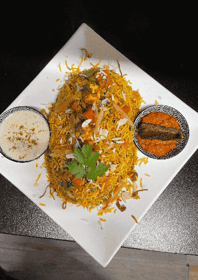Seasoned garden fresh vegetables cooked with basmati rice in herbs and spices.