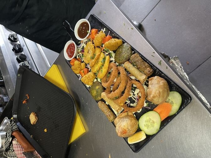 Samosa, vegetable pakoras, onion bhaji and spring rolls.