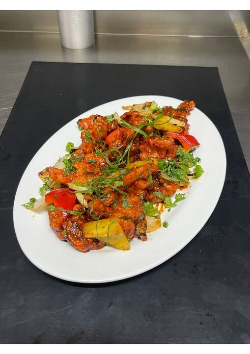 Chicken pakoda sauteed with onion, capsicum, garlic and ginger and a touch of soy sauce.