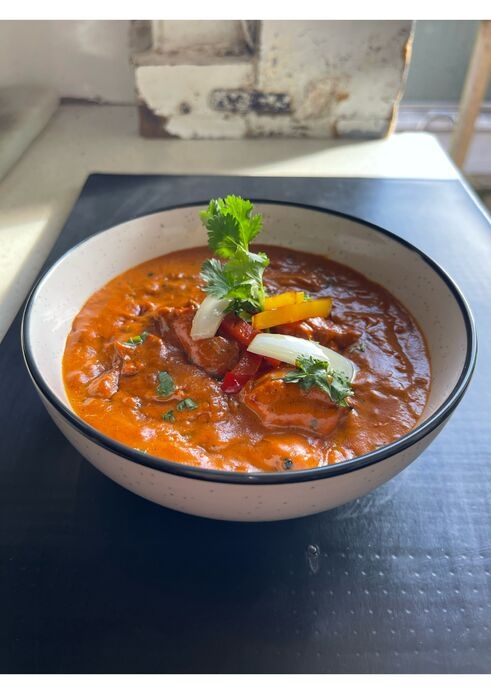 Boneless pieces of chicken cooked in onion, capsicum, and special spices in a creamy tomato sauce.