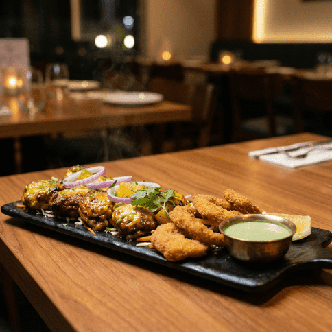 Selection of 4 Entrees Samosa, Onion Bhaji, Chicken tikka and Lamb Seekh kebabs.